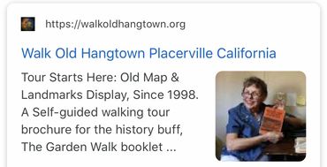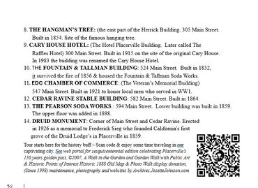 In honor of our sesquicentennial celebrating Placerville's 150 year golden past we published this book © 2007. Free to download here this walking tour shows the historic significance of Placervilles old maps, landmarks, historic Main Street history & village of gold by Marilyn Ferguson and garden projects photos by Josette Johnson.