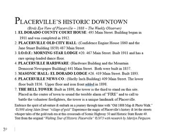 Historic Information for the 1998 "Walk Historic Placerville" of the Old 1888 Map & Main Street Landmarks Photo Walk Display and the 2007 “Historic Garden Walk” Sesquicentennial of Placerville’s 150-year golden past by Josette Johnson and Marilyn Ferguson was taken from the original 1973 “Walking Tour of Historic Placerville” Booklet Written by: Jane Schlappi and Marilyn Ferguson.